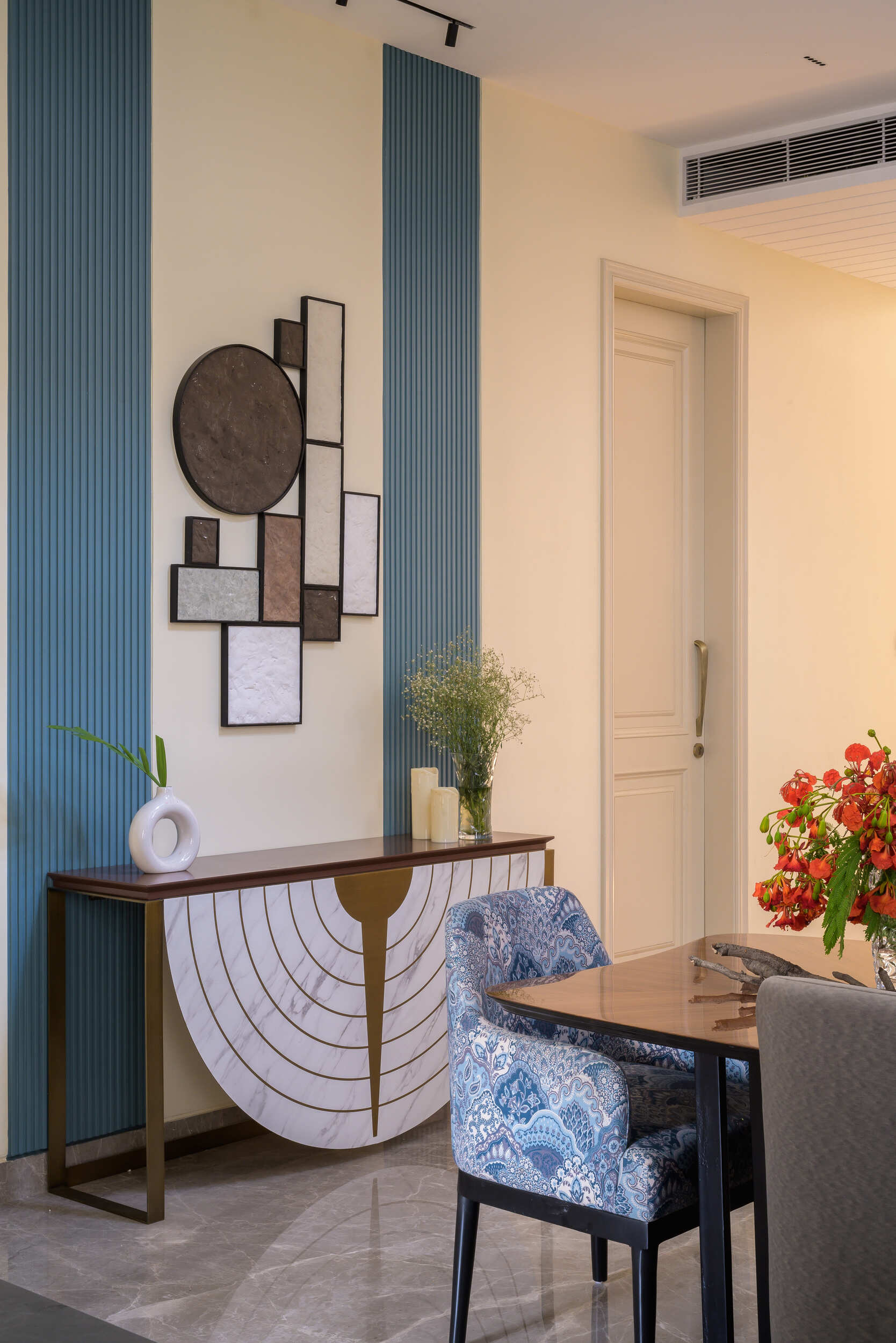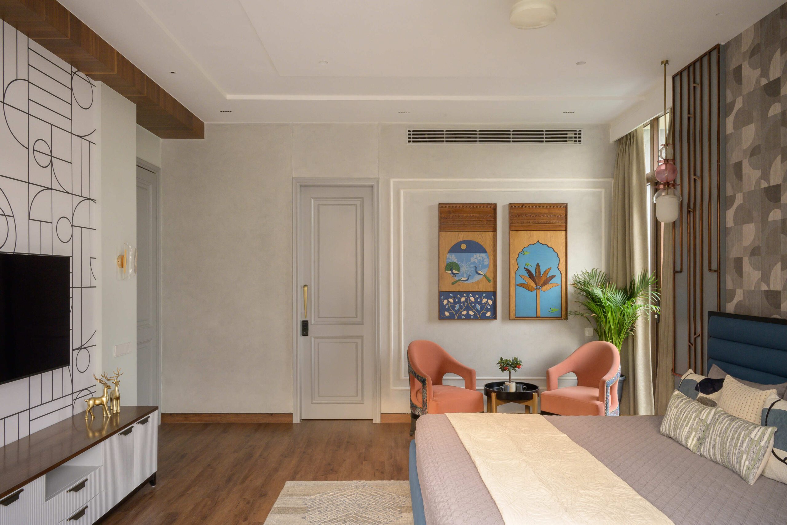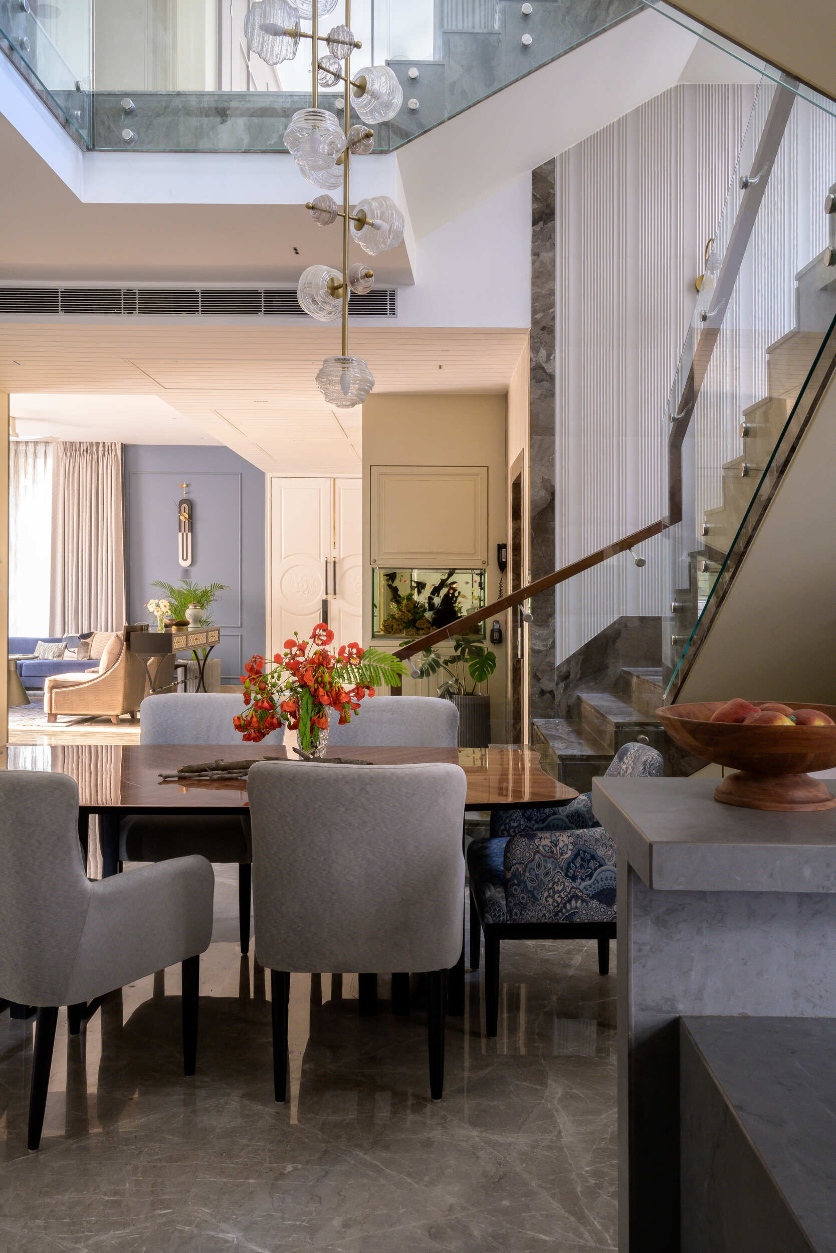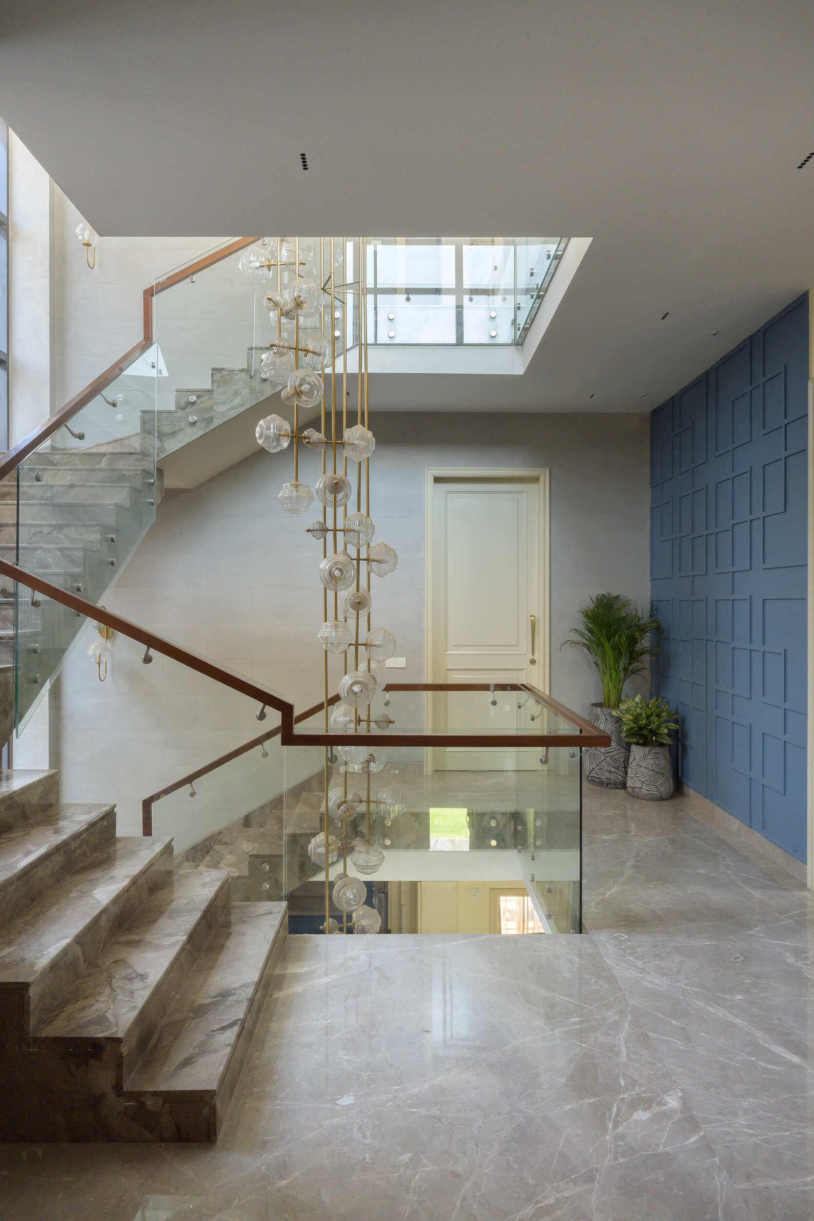 Inside, the residence unfolds into serene bedrooms, airy lounges, and bespoke living spaces. A sculptural staircase anchors the home, while curated artworks, refined finishes, and crafted details add depth and sophistication. Seamless connections between indoor and outdoor areas enhance its character, creating an environment both intimate and expansive.